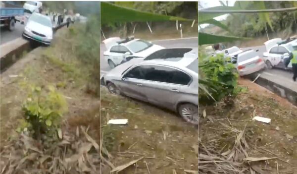 另一段视频显示,25日白天,警方在一段两侧有山林的公路上设卡检查时,一辆与上述被盗车辆外形、颜色相似的宝马新能源轿车撞开路障强行冲卡,并冲到道路一侧越过排水渠,绕过前方警车及其它车辆试图逃逸。有网友称,事发地点在梧州岑溪市。