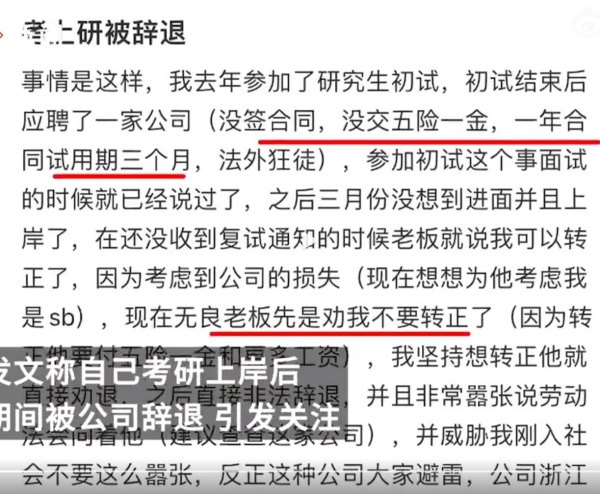 导读:4月26日,浙江丽水一网友发文称自己考研上岸后被公司恶意辞退,引发广泛关注。该公司一员工回应称,辞退该员工是因其没有通过试用期考核。