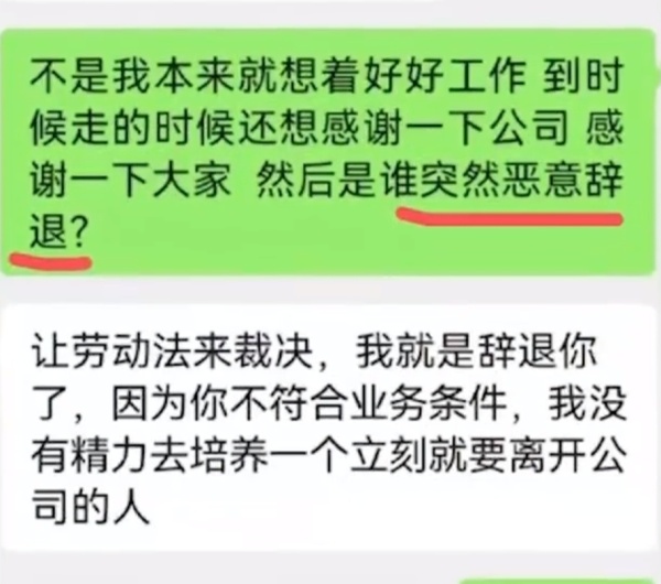根据当事人晒出的聊天记录来看,该公司表示辞退当事人是因为其不符合业务条件,公司没有精力去培养一个立刻就要离开的人,而当事人则表示公司是恶意辞退自己。