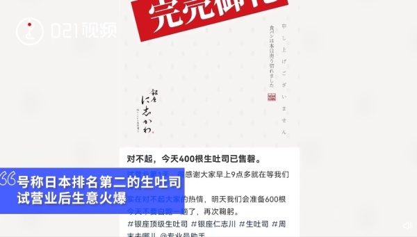 4月26日,据新闻晨报“021视频”报道,上海新开业的一家面包店生意火爆,号称日本排名第二的生吐司,一条生吐司售价98元,限量400个左右,半天便已售罄。