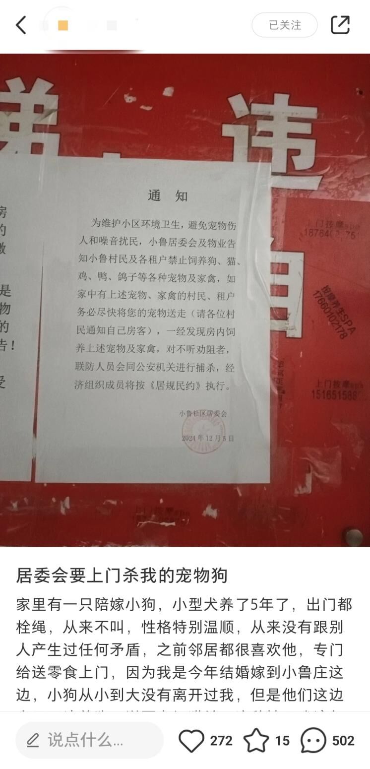 根据网民发布的,落款为小鲁社区居委会的《通知》:为维护小区环境卫生,避免宠物伤人和噪音扰民,小鲁居委会及物业告知小鲁村民及各租户禁止饲养狗、猫、鸡、鸭、鸽子等各种宠物及家禽,如家中有上述宠物、家禽的村民、租户务必尽快将您的宠物送走(请各位村民通知自己房客),一经发现房内饲养上述宠物及家禽,对不听劝阻者,联防人员会同公安机关进行捕杀,经济组织成员将按《居规民约》执行。在该网民发布图文的下方评论中,多位网民对该份《通知》表达了不满,并认为只要是在禁养条例名单之外的宠物,应允许饲养,而不该被捕杀。同时还有网民指出,社区是基层群众自治组织,发布《通知》应充分听取居民的意见和建议。
