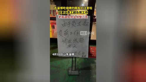 “由于员工超负荷工作,停业休整三天。”4月18日,有网友发布的视频显示,山东一家烧烤店门前,贴出了这样一则通知。极目新闻记者联系到这家烧烤店的老板杨先生,他表示由于长达一个多月的超负荷工作,他和妻子及店内30余名员工都已经累得干不动活了,“现在已经不是钱的事了,保命要紧。”