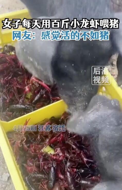 4月26日,据陕广电报“后浪视频”报道,4月25日,在江苏宿迁,朱女士农庄内养七八头猪,每天用上百斤小龙虾来喂猪。