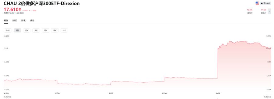 12月9日(周一),二倍做多沪深300ETF-Direxion期权(CHAU)上涨13.32%,当天早盘,其看涨期权合约价格升至每份4.02美元。