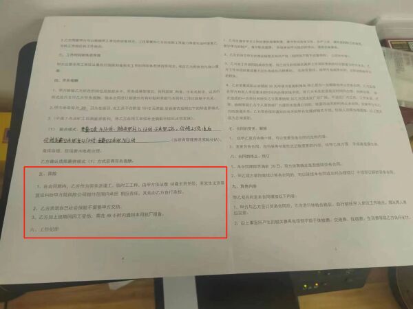 王先生提供的劳务合同书中显示,妻子与安徽林威德人力资源有限公司于2月6日签订劳务派遣合同。其中保险一栏下写有“乙方作为劳务派遣工,临时工工种,由甲方依法缴纳雇主责任险,若发生法律事宜或纠纷甲方就保险公司赔付范围内承担相应责任,其余由乙方自行承担。”在社保相关的条款中提到“乙方承诺自己的社会保险不需要甲方交纳。”