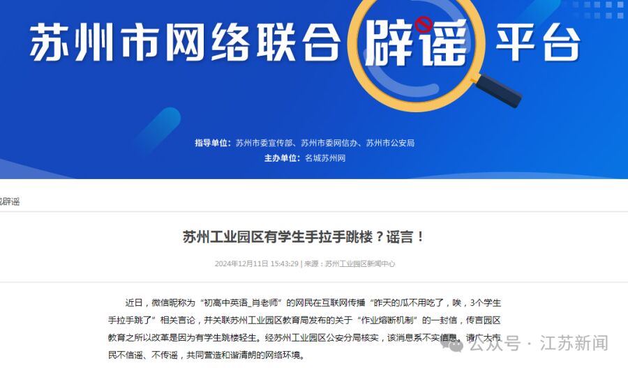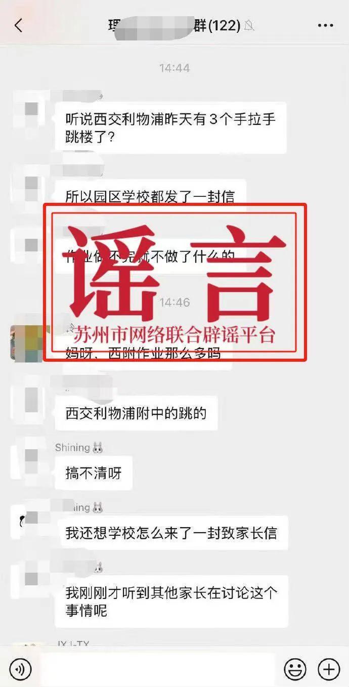 近日,微信昵称为“初高中英语_肖老师”的网民在互联网传播“昨天的瓜不用吃了,唉,3个学生手拉手跳了”相关言论,并关联苏州工业园区教育局发布的关于“作业熔断机制”的一封信,传言园区教育之所以改革是因为有学生跳楼轻生。经苏州工业园区公安分局核实,该消息系不实信息。