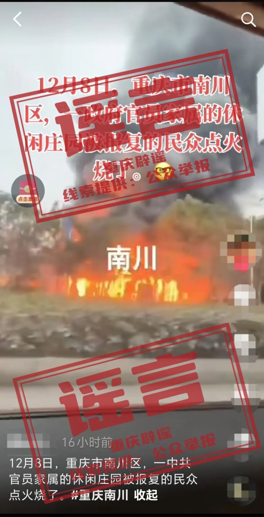 经向相关部门核实,南川未发生“一休闲庄园被人烧了”事件。网传视频实为“12月8日南川区东城街道东胜黄家湾餐堂因电焊作业引发火灾”。该网民为博取关注、吸引流量,故意编造谣言。目前,谣言线索已转交公安部门进一步调查处置。