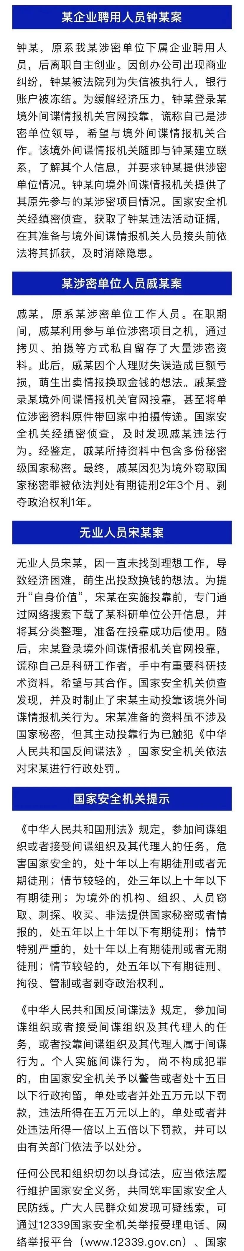 12月16日,“国家安全部”微信公众号发布《国家安全机关破获多起主动投靠境外间谍组织案件》,文章称,近期,国家安全机关陆续破获多起涉案人员主动投靠境外间谍情报机关危害国家安全案件,及时消除泄密隐患,给予不法分子有力震慑。