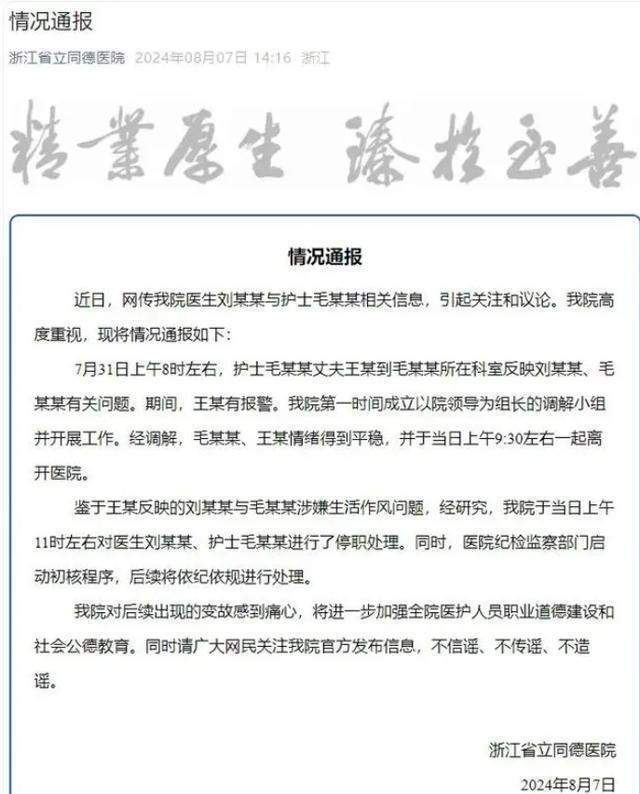针对此事,8月7日浙江省立同德医院发布情况通报。近日,网传浙江省立同德医院医生刘某与护士毛某相关信息,引起关注和议论。医院高度重视,现将情况通报如下: