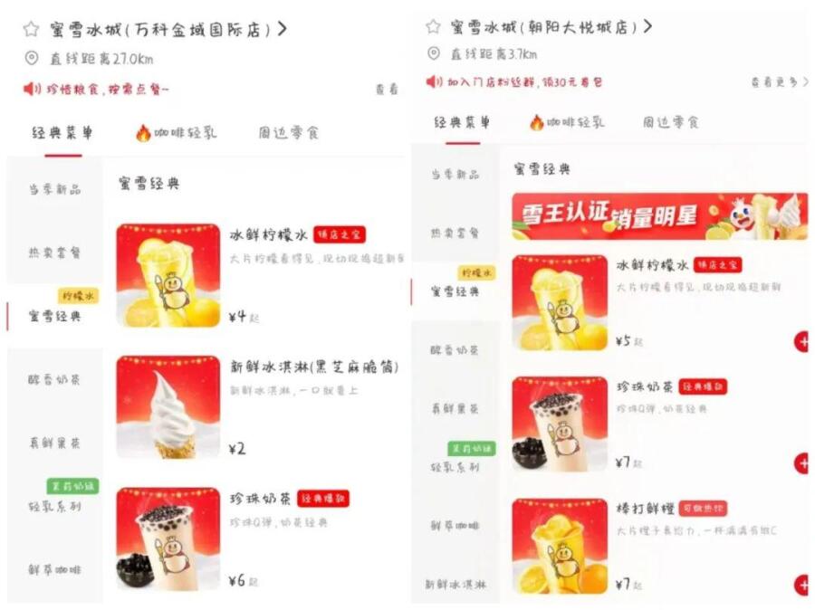 涨价的门店饮品、甜品价格均上涨1元。以北京地区为例,据蜜雪冰城小程序显示,未在涨价区域的门店,冰鲜柠檬水为4元,而右图中位于朝阳区的门店显示为5元;珍珠奶茶在未涨价门店售价6元,而在涨价的门店为7元。