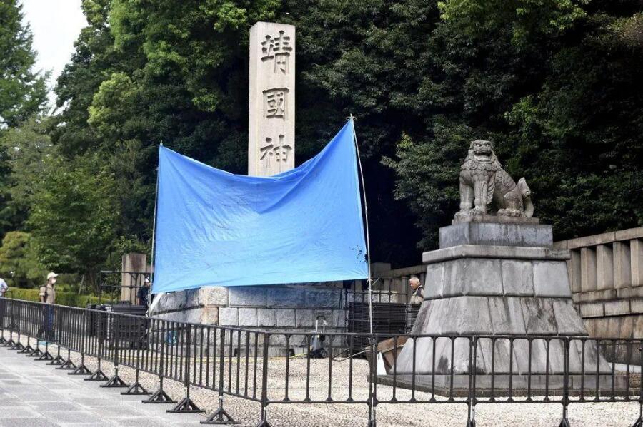 被工作人员罩住涂鸦处的靖国神社石柱 读卖新闻