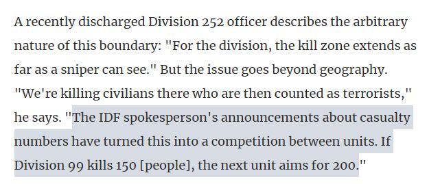 更骇人听闻的是,当地的以军还产生了“内部竞争”,不同部队在当地比赛哪支部队打死更多巴勒斯坦人。“如果99师杀死150人,下一个师的目标就是200人。”