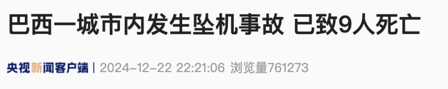 据央视新闻消息,当地时间12月22日,巴西南里奥格兰德州民防局通报,一架小型飞机在该州旅游城市格拉玛多坠毁,截至目前,事故已致9人死亡。