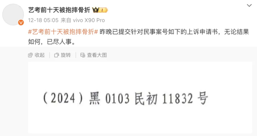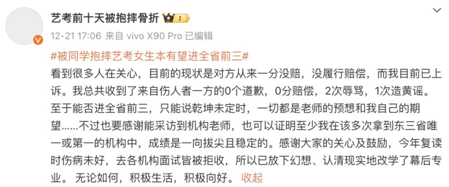 12月9日,小文在个人社媒发布长文更新事件进展,表示“目前告对方刑事没有立案,民事刚刚下判决书,赔了两万多一些,至今为止我没有得到任何道歉”,自己复读时后遗症依然存在,与表演彻底无缘。