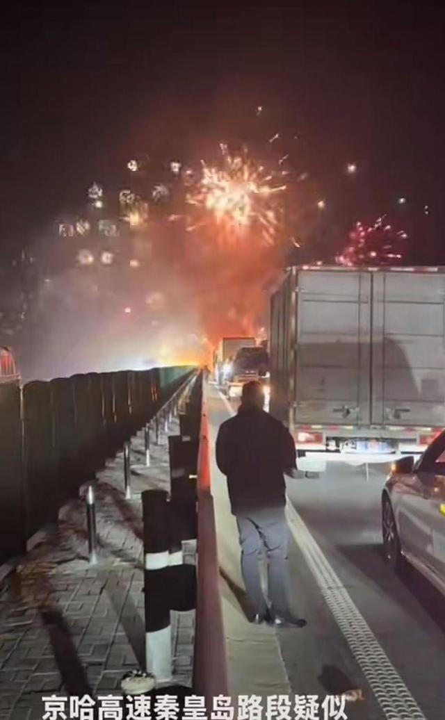 12月23日晚,多名网友发布视频称,京哈高速卢龙段,一辆运输车上装载的烟花发生爆炸,造成交通拥堵。