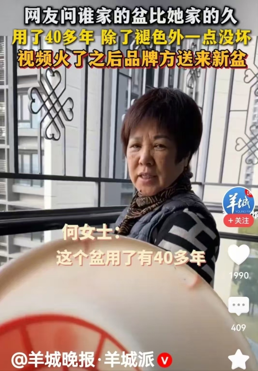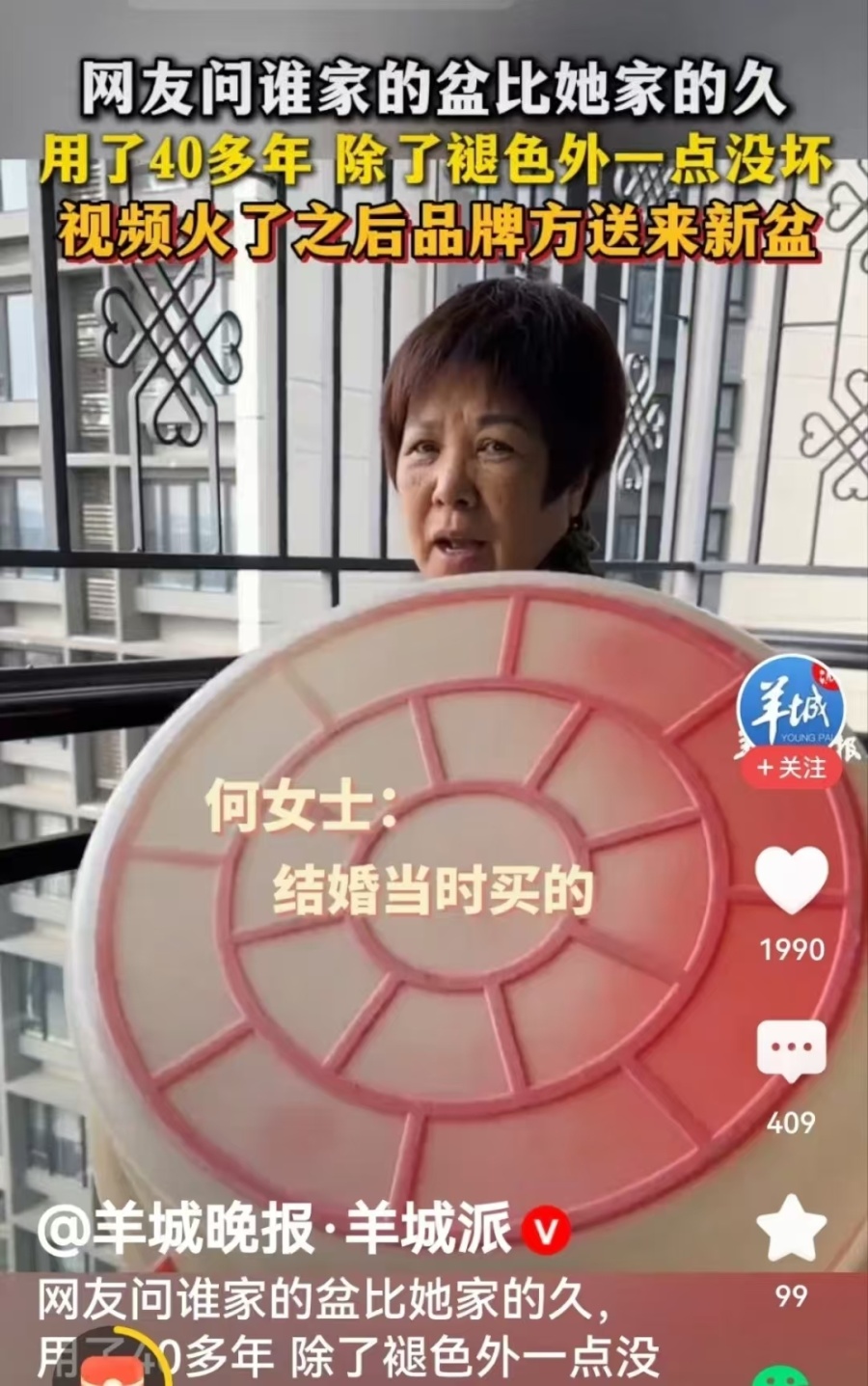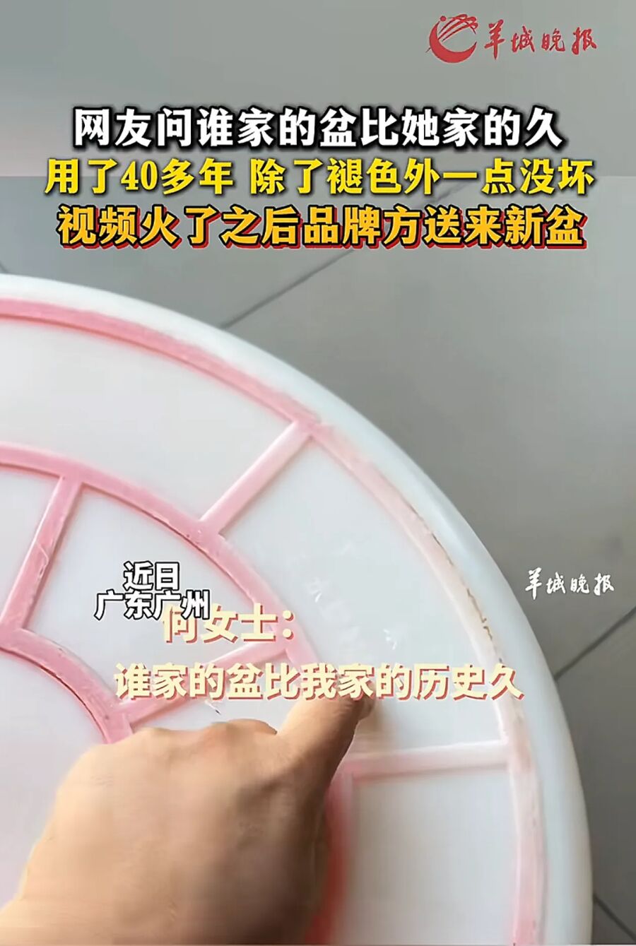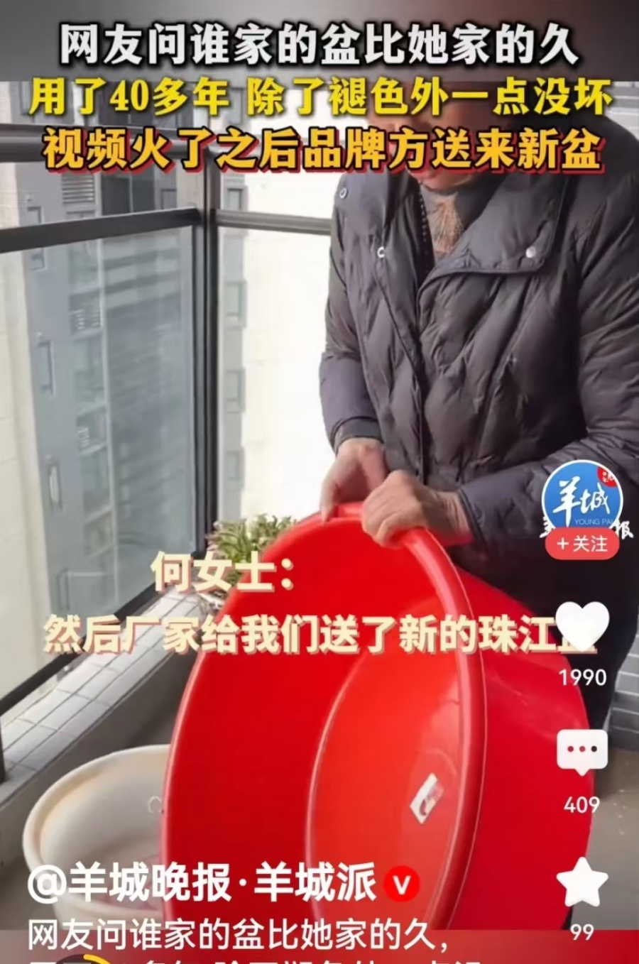 最近,一个广州女士晒出了她结婚时买的塑料盆,用了整整40年还没坏。这消息一出,瞬间刷屏,甚至还引来了品牌方的“神秘回访”,特地送了她一个崭新的塑料盆!网友们笑称:这塑料盆不仅坚挺,连品牌也“长寿”,真是传奇!