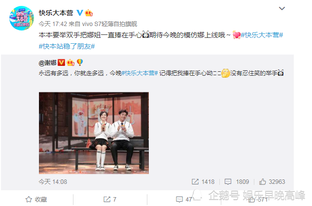 就在网友热议的同时,谢娜她发文回应表态,一连发了两条为快本宣传的动态,表明了自己的态度,其中谢娜发文艾特了快乐大本营,并说记得把我捧在手心吆。快乐大本营也回复了谢娜,本说要举双手把娜姐一直捧在手心里,疑回应当天谢娜离开快乐大本营的爆料,否认谢娜将离开。