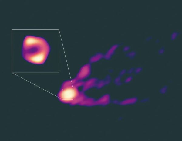 此次,天文学家用3.5毫米波段开展了新观测。他们拍摄到的黑洞照片中,依然可以清晰看到“甜甜圈”——黑洞周围绕转着热气体,这些气体在不断发出辐射,形成亮环。与此同时,黑洞附近被“吐出”的气体也被拍到,“甜甜圈”长出了“尾巴”。