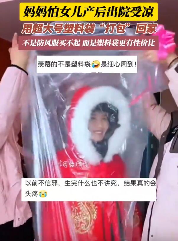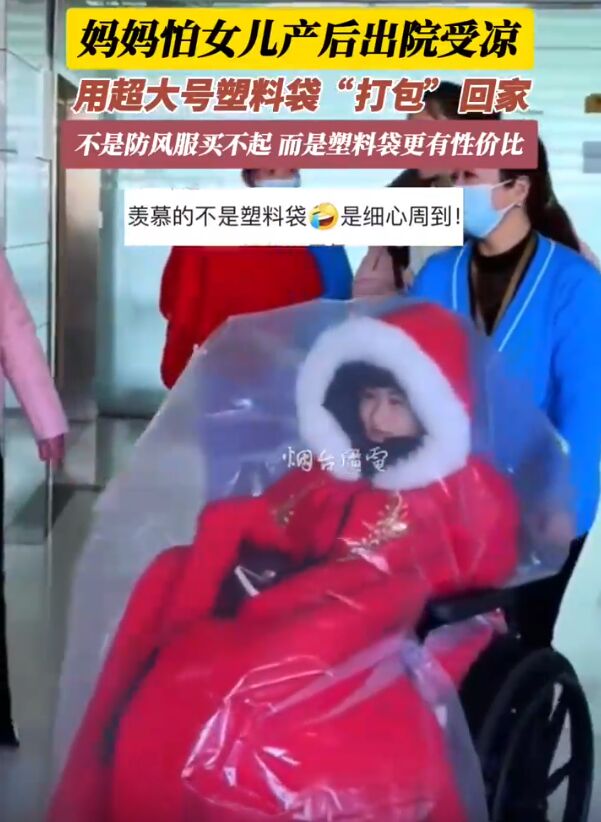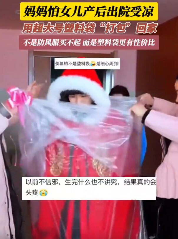 真是亲妈啊!河南,女子产后出院,妈妈担心女儿受风着凉,直接找来一个超大的塑料袋,将女儿“套”进去,随后送进了月子中心,网友:太娇贵了吧?