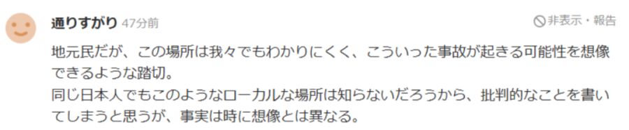 我是本地人。这里确实是一个容易发生事故的路口,就是本地人也会犯迷糊。所以即使是日本人,可能也不知道这种地方,就会发出批评的评论,但事实有时与想象的不同。这是一起非常令人遗憾的事故,首先我个人想对逝者表示哀悼。