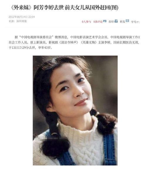 信息来源:凤凰网2012.8.14——《外来妹》阿芳李婷去世前夫女儿从国外赶回
