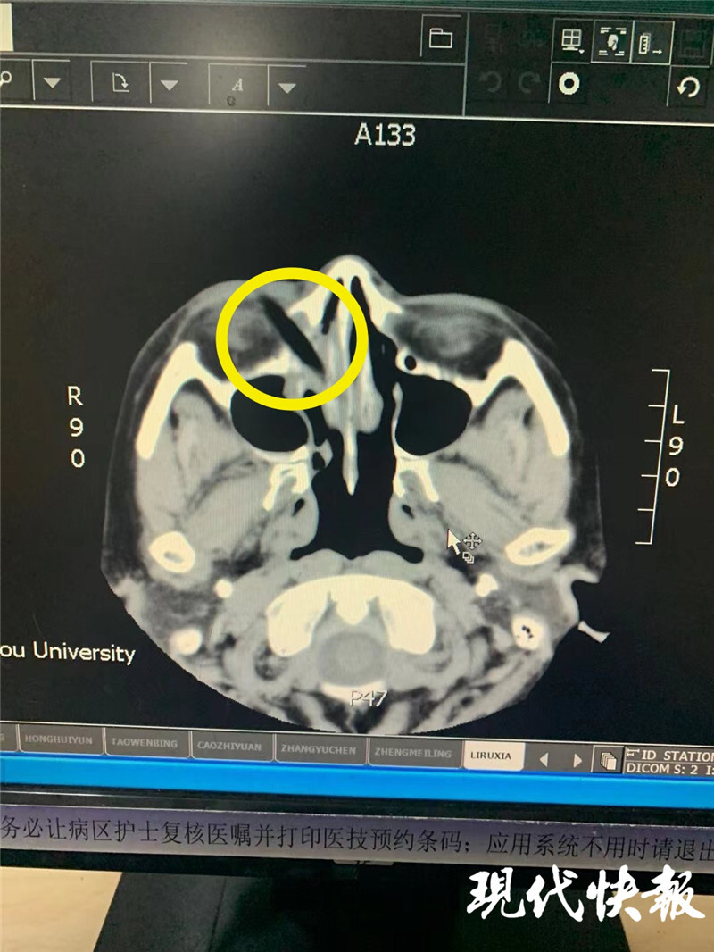 现代快报讯(通讯员 傅轩 记者 顾潇)近日,江苏扬州一名女子骑电动车时不慎摔倒,不料一根5.5厘米长的小树枝戳进了她的眼睛。树枝从下眼睑插进去,透过内下壁的骨头插到鼻腔,没有伤到眼球。经过扬州大学附属医院医生的救治,目前该女子视力已经恢复。
