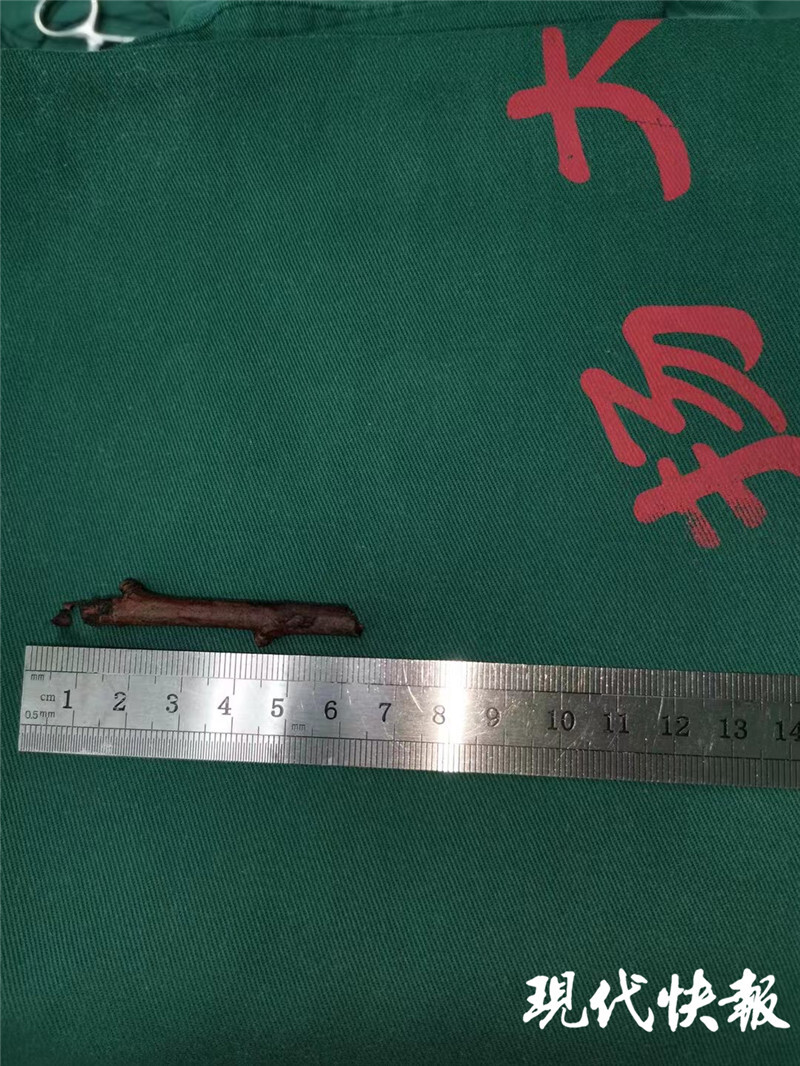 经检查,眼科副主任医师刘伟发现,插进了李女士眼睛里的是一节5.5厘米长的小树枝,留在外面的部分很短,大部分经由眼眶插进鼻腔内,如此长的异物插进眼眶十分罕见。“这根树枝从患者下眼睑插进去,透过内下壁的骨头插到鼻腔,情况比较危急。”据刘伟介绍,这属于植物性异物,必须马上取出,否则很容易造成感染。