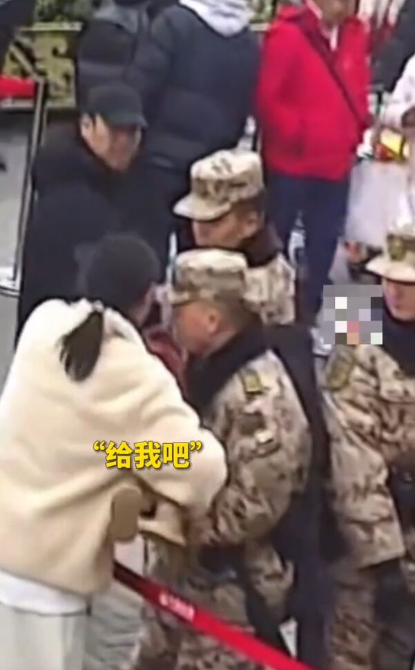 于是她走了过去,把孩子交给了那位武警叔叔。那位武警不仅毫不犹豫地接过了孩子,还温柔地安抚他,笑着说:“没事,叔叔看着你,妈妈很快就回来。”