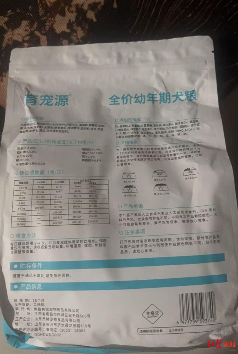 陈女士所接触的也并非宠物饲养员,而是高价狗粮的销售方,为了强调狗粮价格的合理性,他们还会在电商平台开设店铺,挂产品链接。记者看到,陈女士购买的“育宠源”品牌狗粮,委托商为南昌育宠宠物用品有限公司,该公司注册资本仅1万元,员工0人。