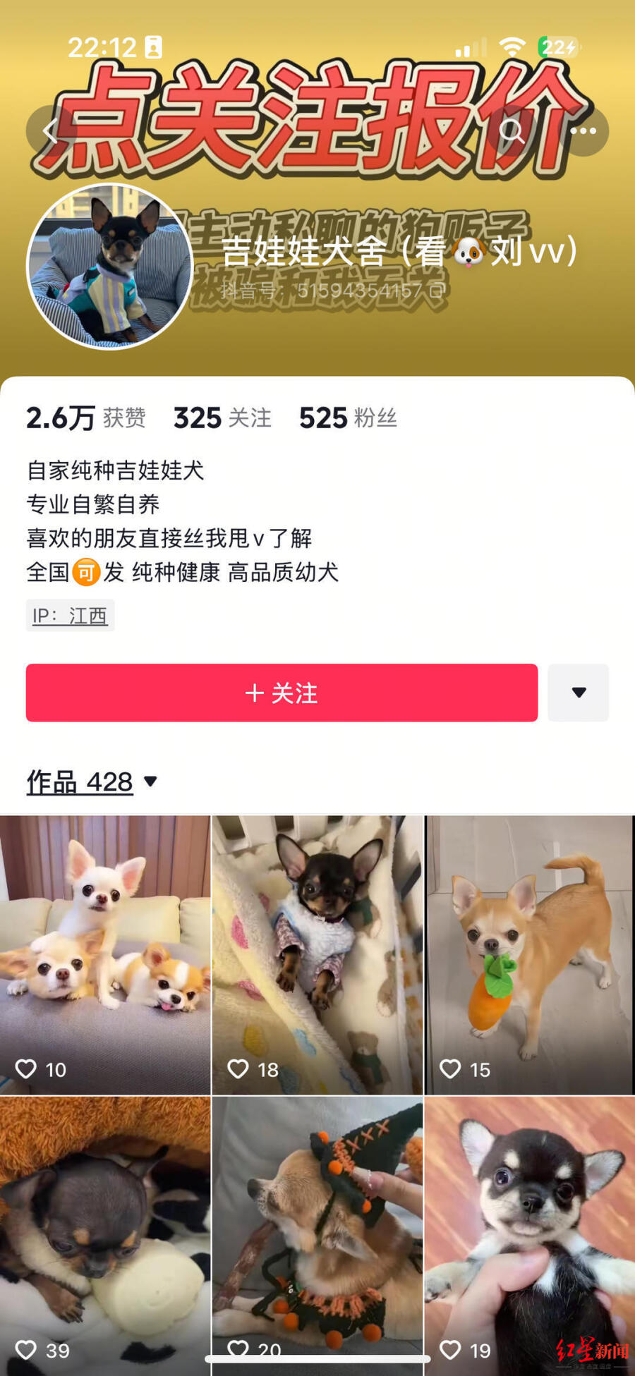 陈女士一直都想拥有一只属于自己的狗。5月初,她刷抖音视频时发现账号名为“吉娃娃犬舍(看狗刘VV)”(现已更名为:丫丫 吉宝宝)的视频中,有几只狗特别可爱,便私信了对方,对方要求她留下微信号。