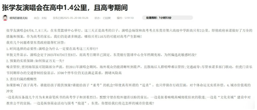 在东莞市阳光问政平台上,已有不少网友提出意见,希望官方将演唱会延期举办。从网友发布的帖子来看,大部分家长的担忧在于,演唱会产生的噪声和人群喧哗是否会影响到考生的复习和休息,演唱会开办期间是否会造成交通拥堵,以及周边的酒店、餐饮等是否将因此而涨价。