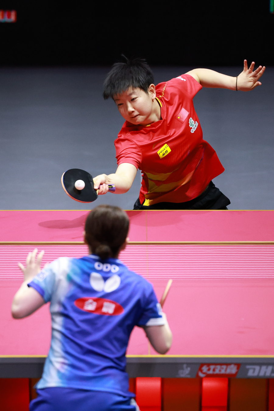 5月23日,孙颖莎(上)在比赛中回球。新华社记者 刘续 摄