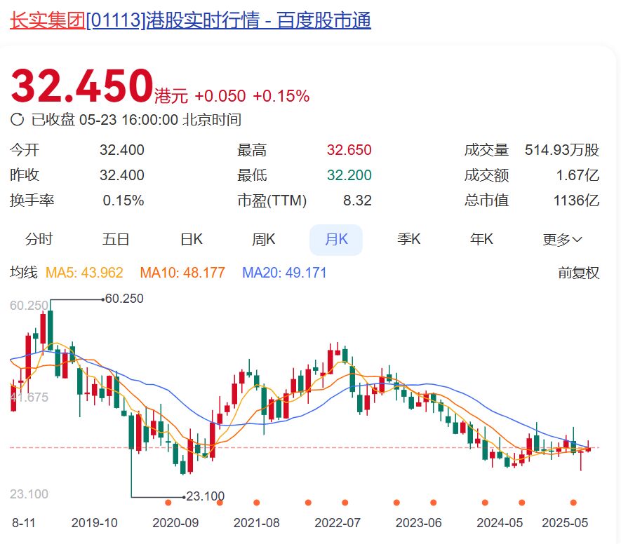 5月22日,长实集团股价跌1.67%,23日微涨0.15%。