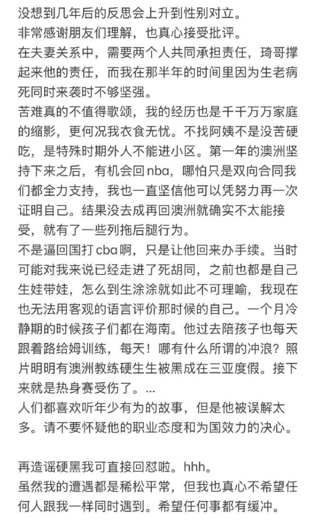 此前,在5月21日时,周琦妻子曾发表小作文谈及自己与周琦过往的艰辛岁月。她表示,周琦效力于澳洲NBL联赛时,因家庭琐事他们曾带着离婚协议去到了民政局。但被网友误解为她用离婚逼迫周琦回CBA打球。