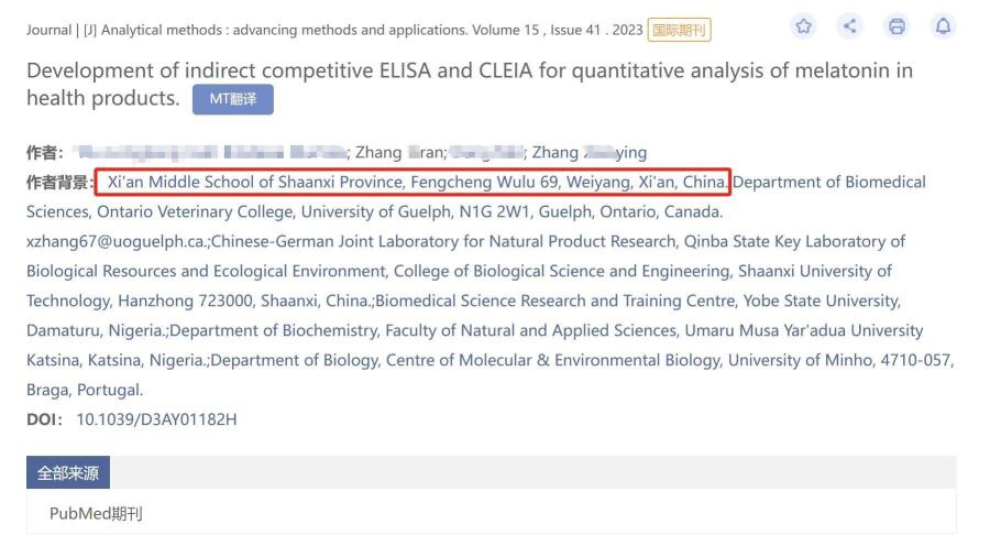 记者在知网查询网友所提到的论文,发现该论文作者一栏的确有张某苒和张某莺的名字。作者简介一栏也写道,张某苒系陕西省西安中学学生,张某莺系陕西理工大学特聘教授。论文发表时间为2023年10月17日,发表期刊为《Analytical Methods》。
