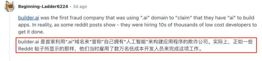 还有知情人士直接透露Builder.ai其实就是用「ai域名」来欺诈的公司。公司里雇佣了大量的低成本开发人员来「假装AI」。