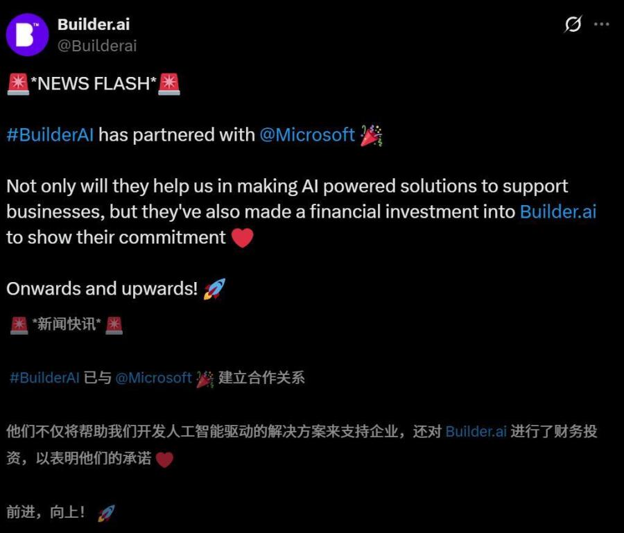 微软宣布成为Builder.ai的战略投资者和合作伙伴