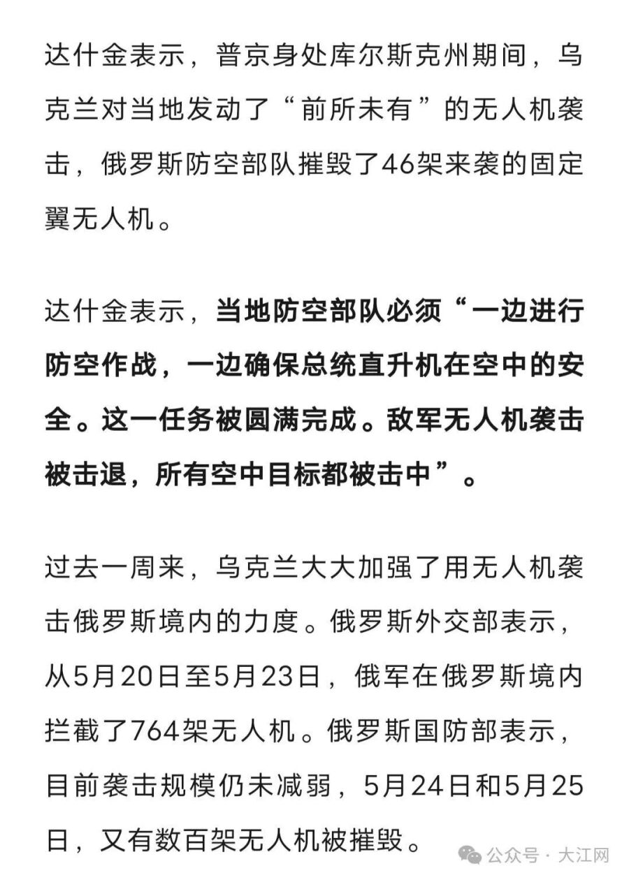 达什金在俄罗斯-1频道5月25日播出的一段采访中表示,在库尔斯克州,普京乘坐的直升机发现自己“处于击退敌军大规模无人机袭击行动的中心”。