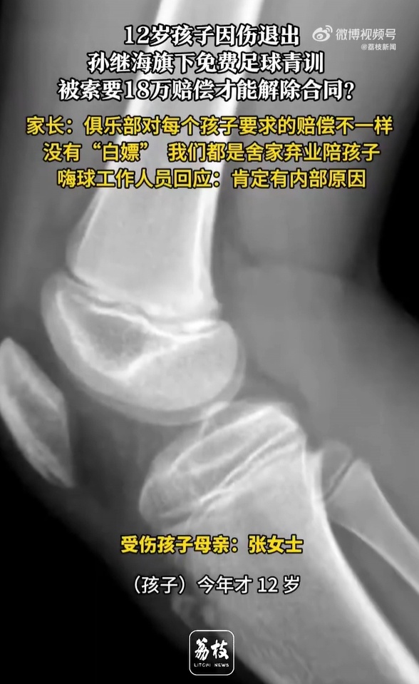 受伤孩子母亲张女士告诉荔枝新闻 ,他们老家在陕西西安,2024年2月特意带孩子前往大连加入“嗨球”青训,每天除去上学、写作业,训练时间至少4小时左右。在较高的强度之下,孩子膝盖受伤,有“胫骨结节炎、髌腱炎、骨裂”,教练的一些不当言语也给孩子造成心理伤害,因而产生退出的想法,却被索要高额赔偿才能换取“自由身”。
