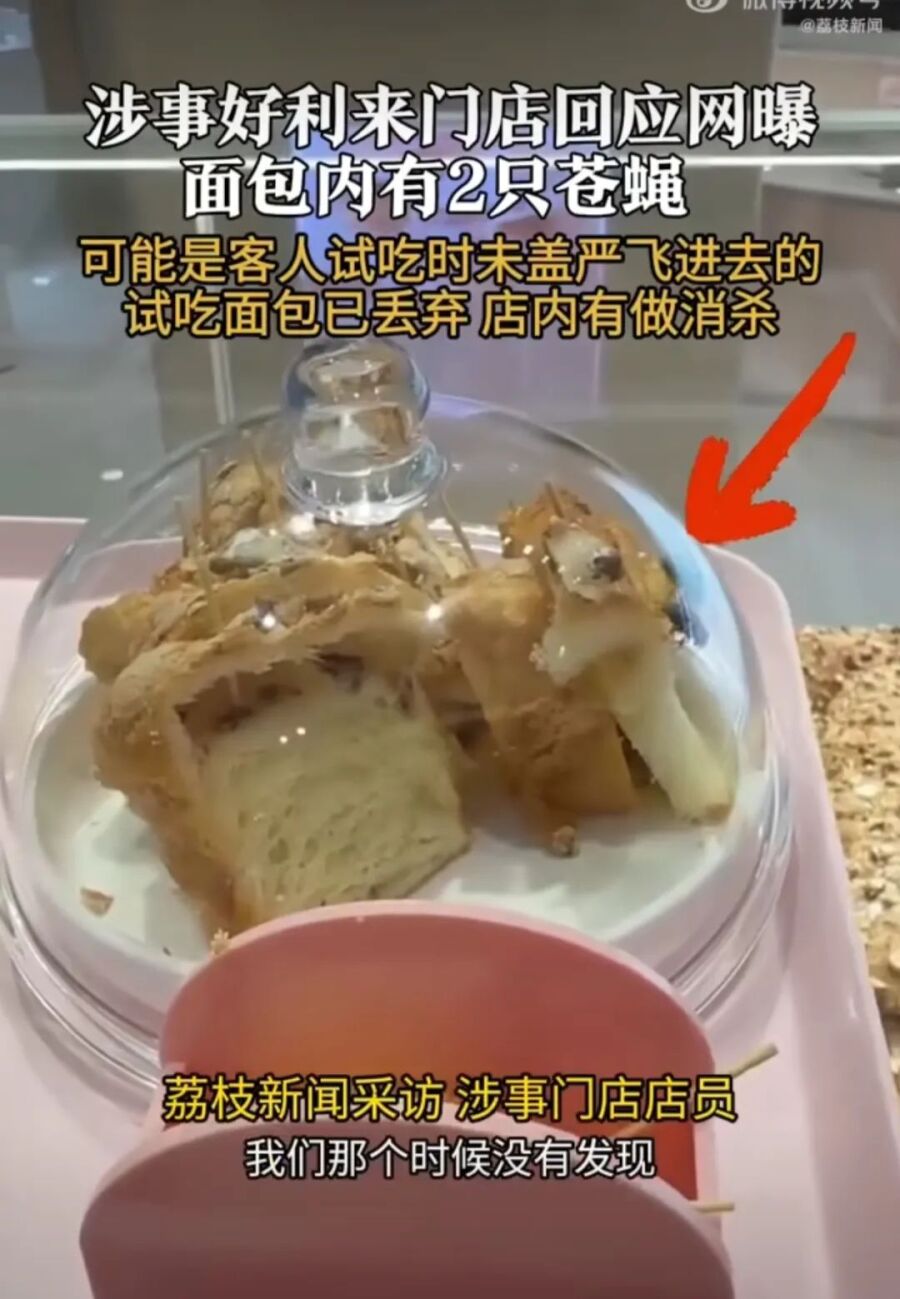近日,浙江宁波,网友爆料称一好利来门店的试吃面包上有2只苍蝇。涉事门店店员回应@荔枝新闻 记者表示,可能是客人试吃时盖子没有盖严,导致苍蝇飞进去,发现后已把试吃面包扔了,店内有做消杀。 (荔枝新闻)