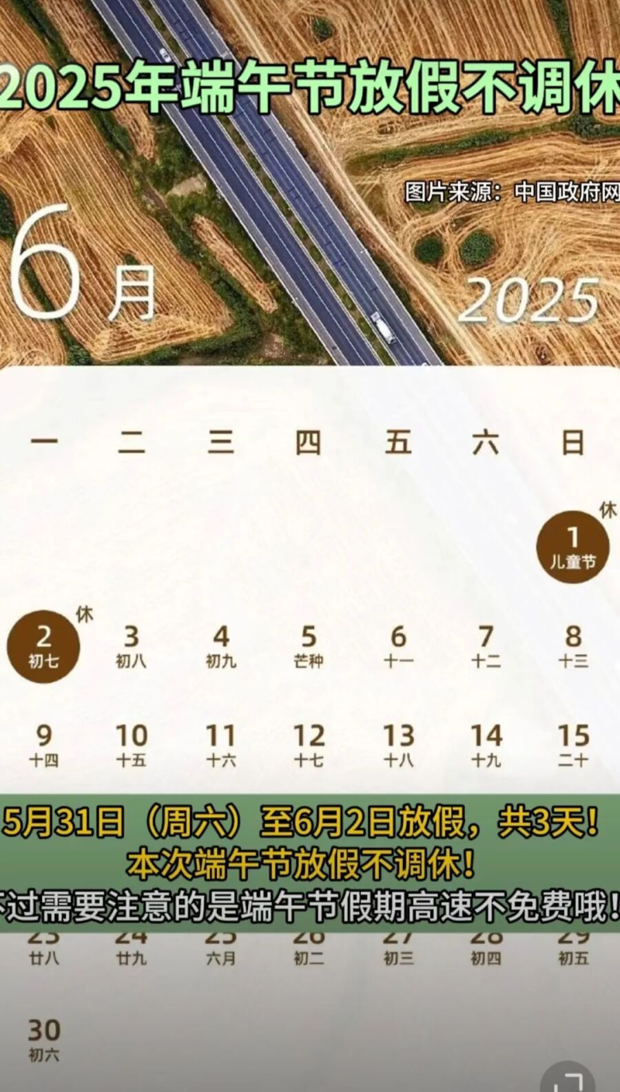 就在本周末,端午节小长假来啦!5月31日(周六)至6月2日(周一)放假,共3天。要自驾出行的小伙伴们注意,端午节假期高速不免费。(红星新闻)