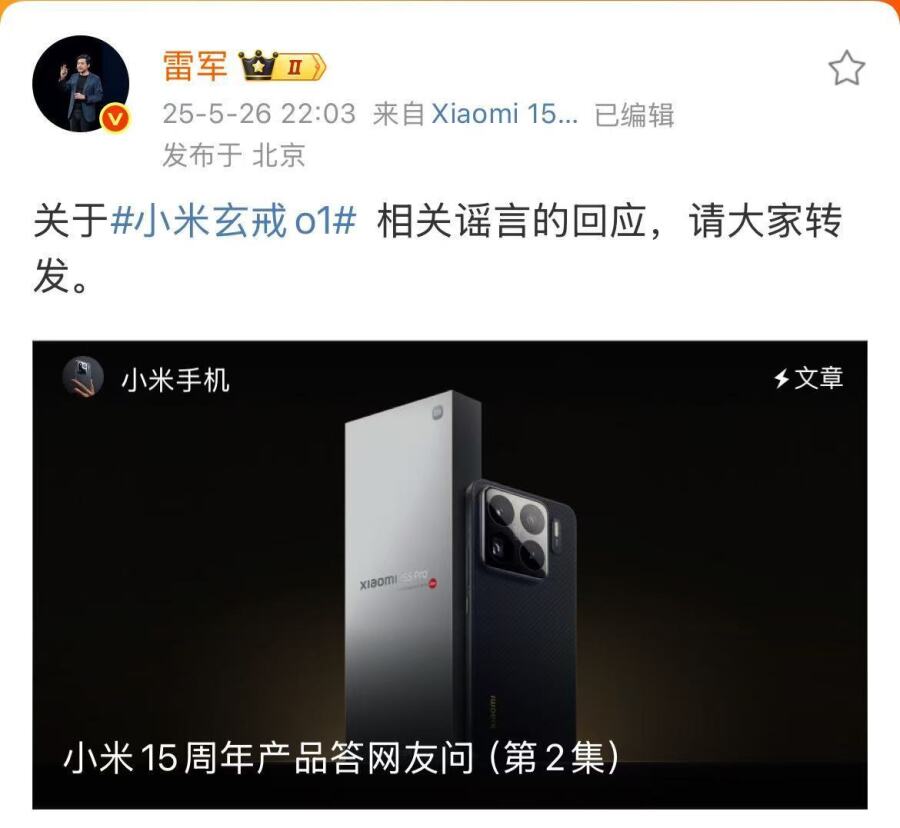 对此,雷军转发并配文:关于小米玄戒o1相关谣言的回应,请大家转发。