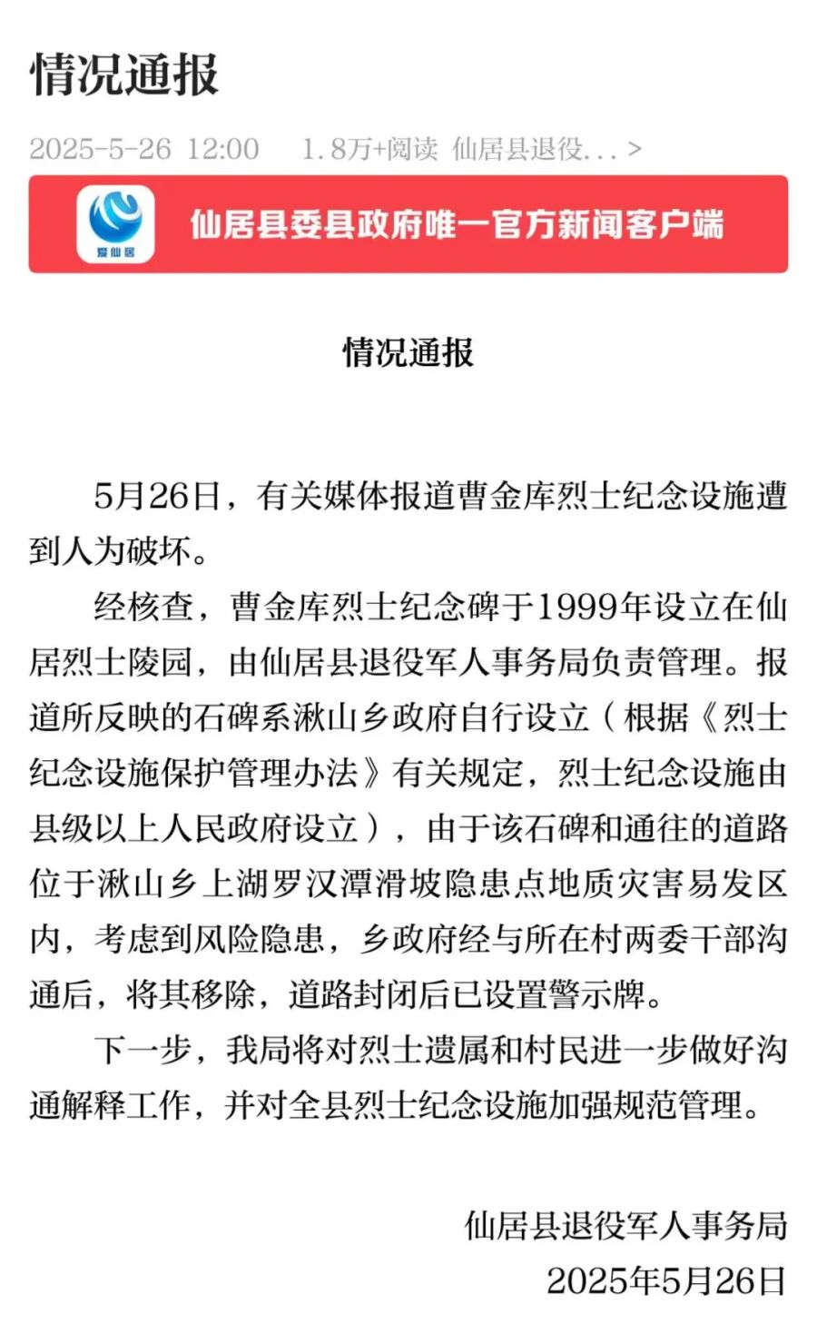 通报称,报道所反映的石碑系湫山乡政府自行设立(根据《烈士纪念设施保护管理办法》有关规定,烈士纪念设施由县级以上人民政府设立),由于该石碑和通往的道路位于湫山乡上湖罗汉潭滑坡隐患点地质灾害易发区内,考虑到风险隐患,乡政府经与所在村两委干部沟通后,将其移除,道路封闭后已设置警示牌。