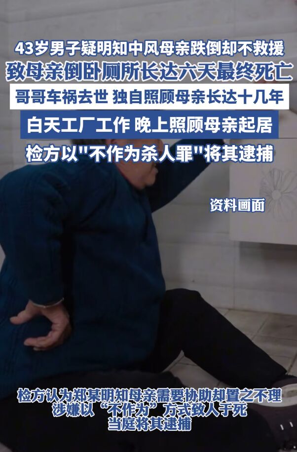 近日,台湾高雄一名43岁男子郑某,疑明知中风母亲跌倒却长时间不救援,导致母亲倒卧厕所长达六天,最终死亡,引发社会震惊。