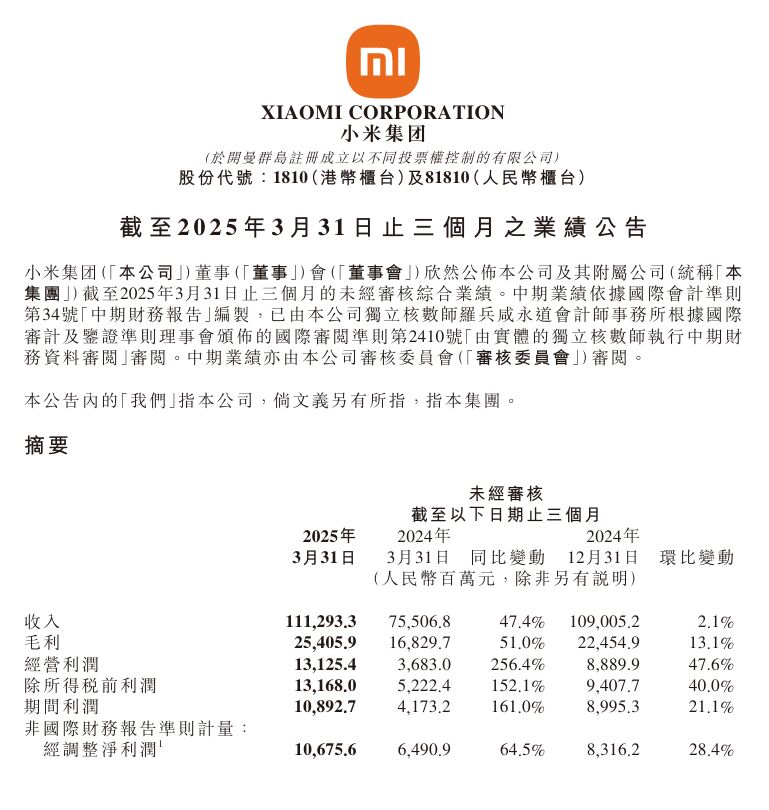 小米集团公告,第一季度营收1112.9亿元人民币,同比增长 47.4%,预估1090亿元人民币;调整后净利润106.8亿元人民币,预估90.7亿元人民币。
