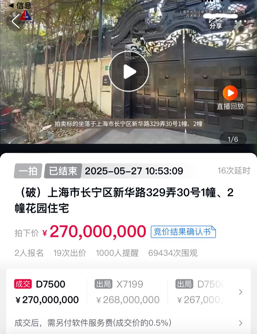 上述房屋用途为居住,房屋类型为花园住宅,于5月26日开始拍卖。该标的物起拍价2.5亿元,以535.04平方米合计建筑面积计,被拍标的物折合起拍单价约46.73万元/平方米。