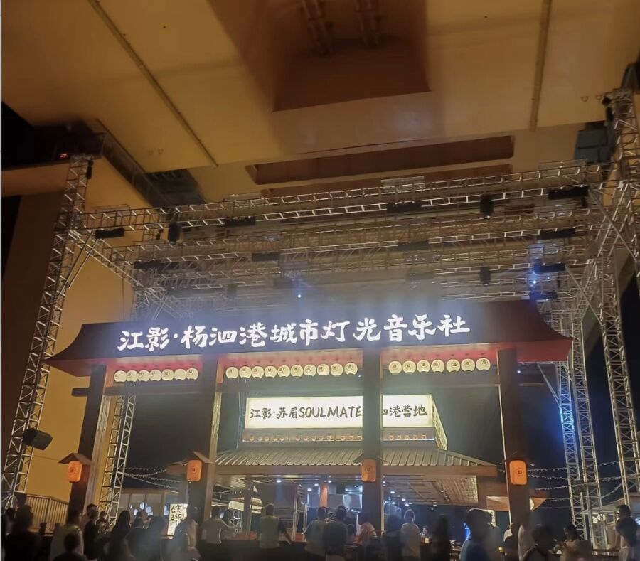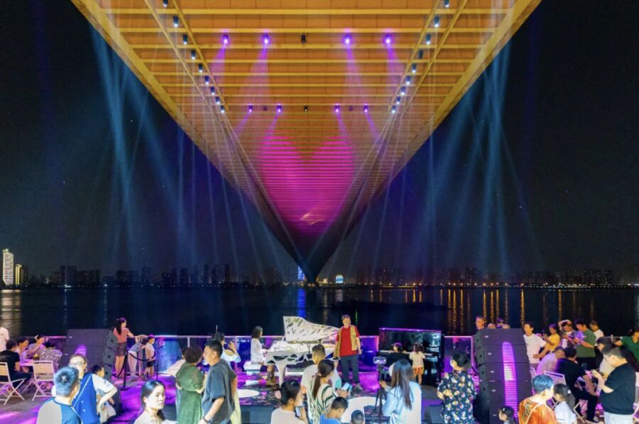 这处打卡地名为江影・杨泗港城市灯光音乐社,据了解,由武汉市城市运维管理有限公司经营,于5月20日对外开放,占地近1400平方米,有咖啡、小吃、演出、文化市集。