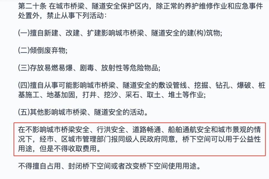 《武汉市城市桥梁隧道安全管理条例》规定“桥下空间可以用于公益性用途,但是不得收取费用”。图源/武汉城管政法委。