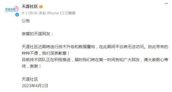 此前,天涯社区官方微博曾于4月1日发布公告称,近期将进行技术升级和数据重构,在此期间平台将无法访问,“请大家耐心等待”。