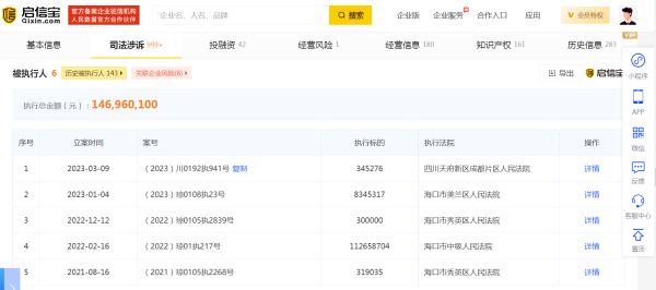 据启信宝,风险信息显示,目前该公司存在6条被执行人信息,累计执行标的超1.46亿元。
